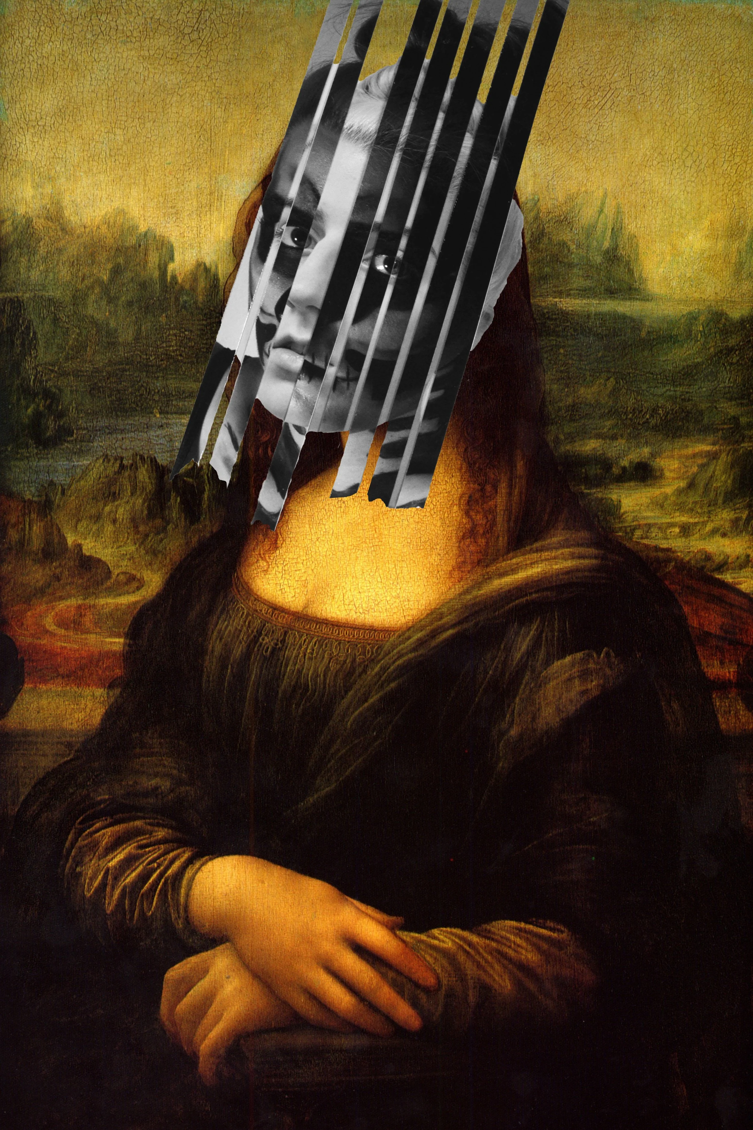 Self-portraits taken and developed, then cut up and collaged over Mona Lisa.