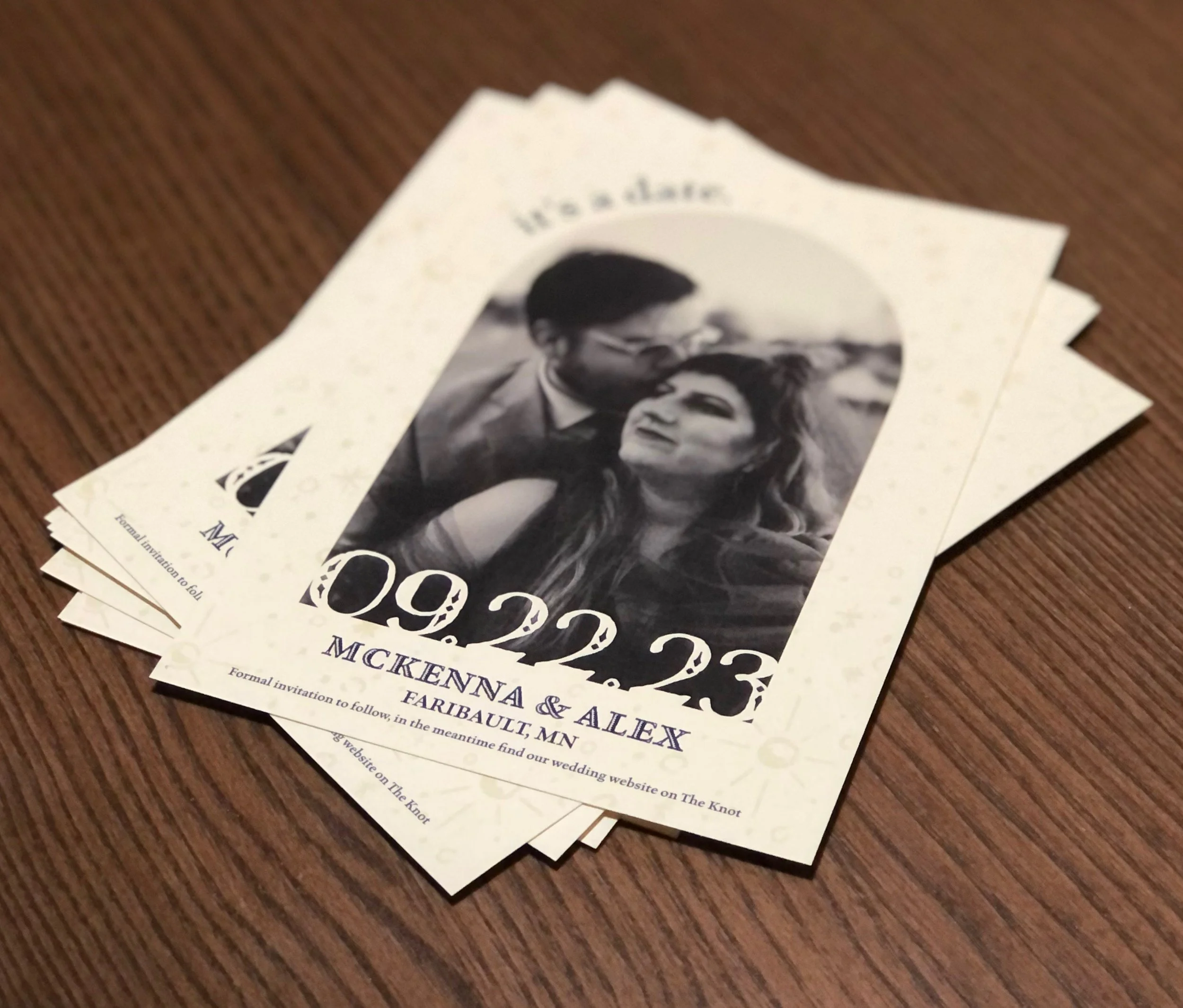 Printed Save the Date for upcoming wedding. Celestial theme is shown in subtle star pattern in background.